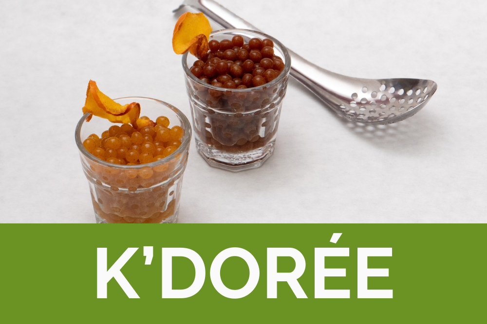 Producto gourmet de esferificaciones de caqui de la Ribera del Xúquer. Disponible en dos versiones: una con canela y miel de abeja y otra con dátil fresco ilicitano (Confitera). Apto para veganos y celíacos, se trata de una forma diferente, sencilla y elegante de incluir fruta en aperitivos, ensaladas, como guarnición, en cócteles o incluso en postres. Elaborado por Ana Aparici Barreiro y José Luis Escudero López.